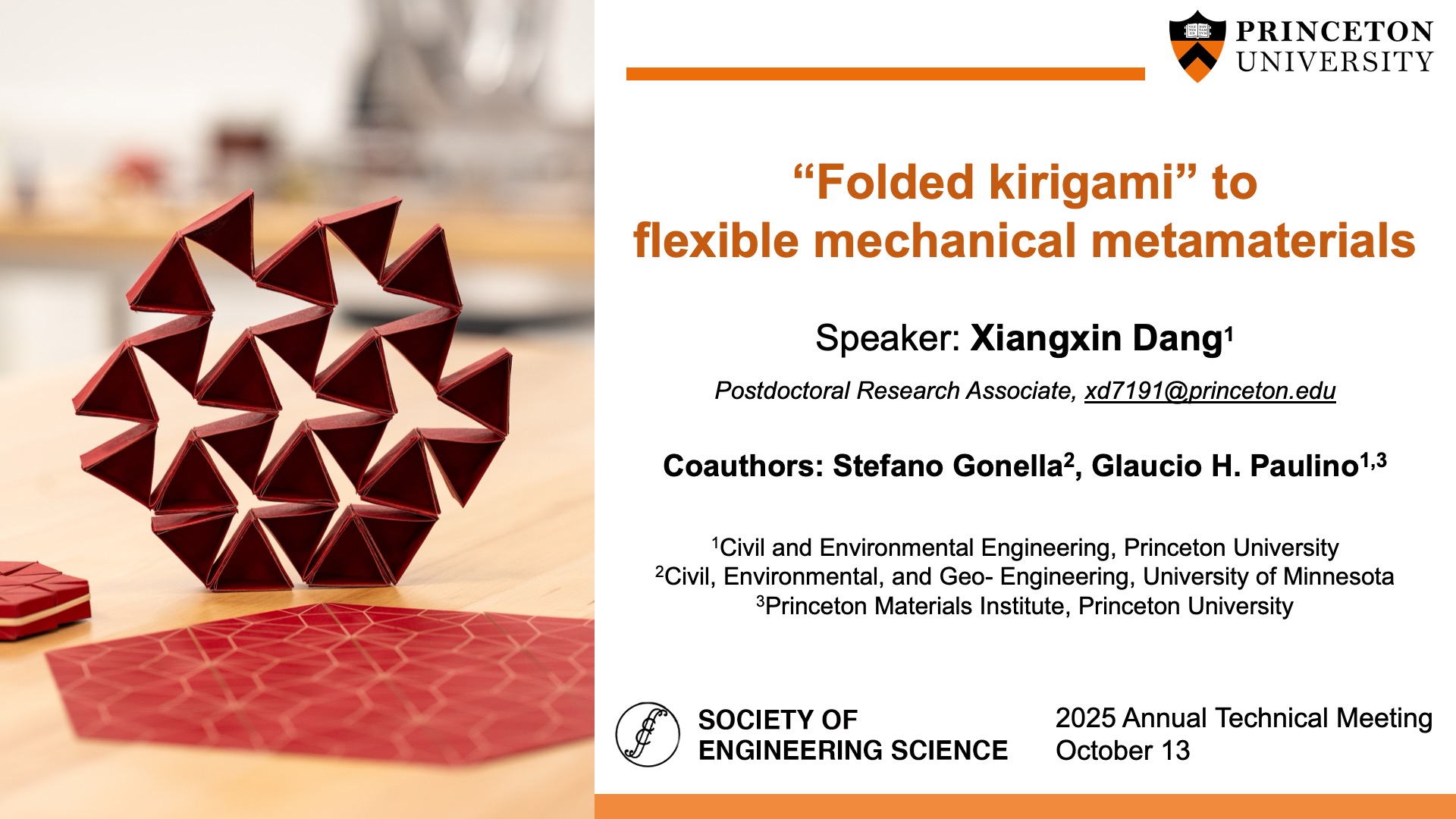 - Oct.2025: I gave the oral presentation “‘Folded kirigami’ to flexible mechanical metamaterials” at the Society of Engineering Science 2025 Annual Technical Meeting in Atlanta.