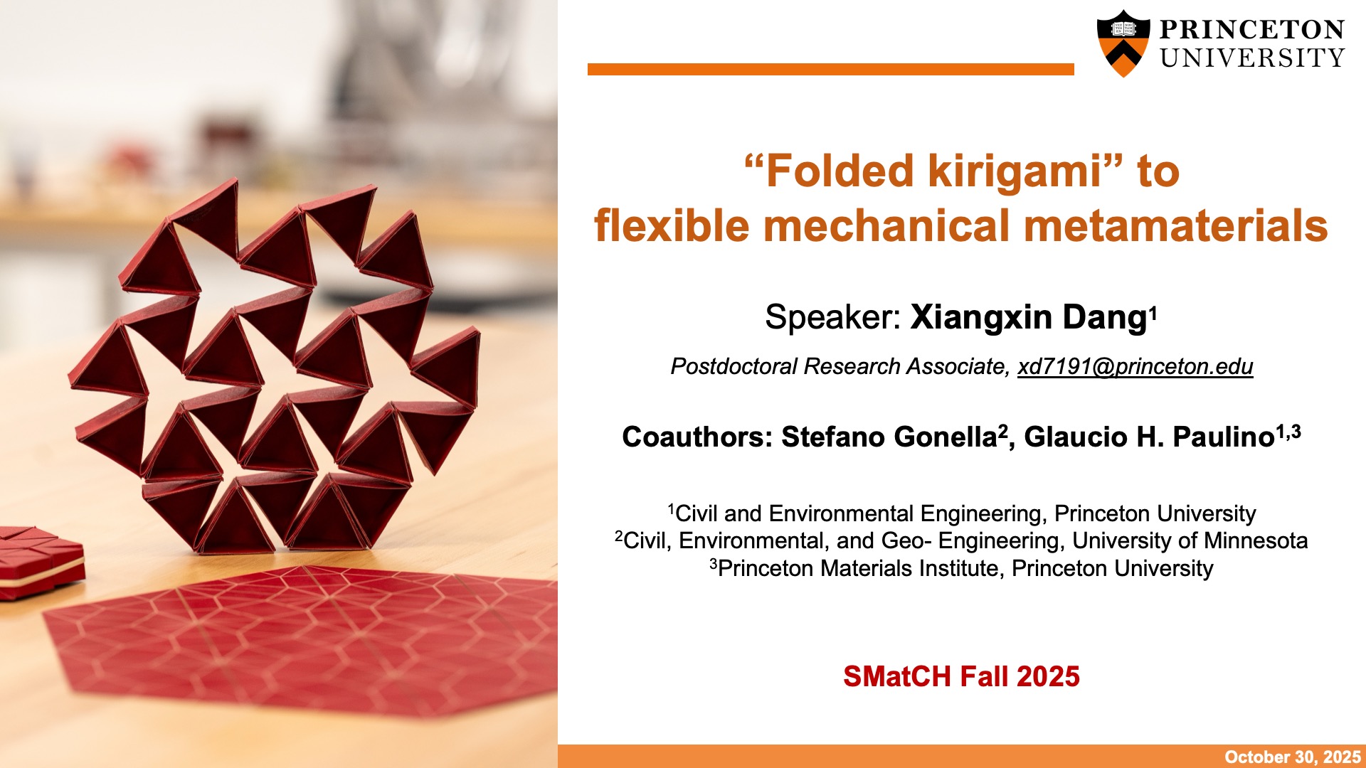 - Oct.2025: I gave the oral presentation “‘Folded kirigami’ to flexible mechanical metamaterials” for the Soft Materials Coffee Hour (SMatCH) Seminar at Princeton University.